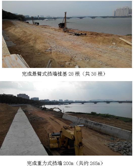 1、擋土墻工程:完成懸臂式擋墻樁基28根,重力式擋墻200m;