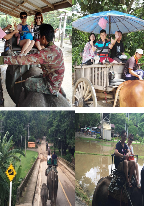 騎大象很有意思,沿路騎著大象的人們都會(huì)互相打著招呼,調(diào)侃著,即使大家來(lái)自不同的國(guó)度,但是微笑、手勢(shì)都是相通的。接著再騎牛車(chē)去竹排漂流的地方,白色的牛是第一次見(jiàn),有一種汗血寶馬的即視感,很帥氣。泰國(guó)的竹排漂流是在靜靜的河面上,兩邊是綿延不絕的青蔥樹(shù)林,仿佛置身于桂林山水中,四周很安靜,竹排就這么輕輕蕩漾在水面,同伴們不自覺(jué)地哼起了歌謠:小小竹排江中游,巍巍青山兩岸走……