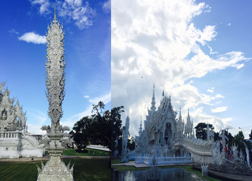 趁著夜幕還未降臨,我們進(jìn)入了白廟,又名【龍坤藝術(shù)廟】,該寺廟由泰國(guó)國(guó)家級(jí)藝術(shù)大師查倫猜大師設(shè)計(jì)修建,整個(gè)寺廟以白色為主,鑲嵌玻璃之后在陽(yáng)光下呈現(xiàn)一片銀白色,堪稱(chēng)是當(dāng)?shù)匾患利惖乃囆g(shù)作品。由于整個(gè)白廟都是以白色為主,給人非常圣潔的感覺(jué),在白廟內(nèi)部有一條白色的橋,人們說(shuō)這是通往天堂的橋,走在上面讓你覺(jué)得一切都如此純凈,沒(méi)有半點(diǎn)污濁,我想天堂應(yīng)該就是這樣吧。
