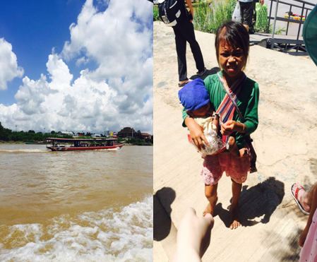 參觀完鴉片博物館后,我們一眾乘坐長(zhǎng)尾船游覽課本中的湄公河,并一腳踏兩國(guó),來(lái)到另外一個(gè)國(guó)度邊境—【老撾】。老撾里面的一條商業(yè)街,大大小小的東南亞風(fēng)情商品,商品都物超所值,尤其香煙。但更讓大家唏噓的是在那遇到好多才幾歲大的孩子,他們?cè)诹胰障孪蛴慰推蛴?、喝游客喝剩的椰汁。我們?cè)谏钪胁挥龅皆愀獾氖虑椋烙?jì)不會(huì)醒悟現(xiàn)在生活的美好,與這些小孩相比,我們是多么地幸福!或許這就是老撾游的特別意義。