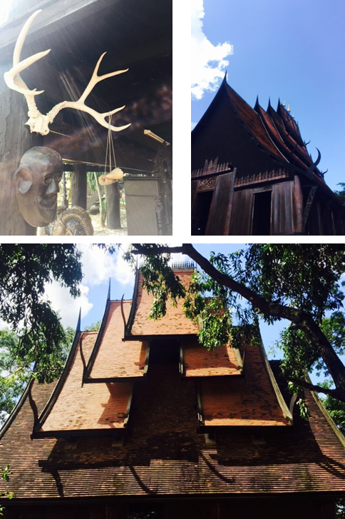 從金三角回來(lái),接著游覽了【黑廟】,如果說(shuō)白廟代表著天堂,那么黑廟則代表著地獄。黑廟是由泰國(guó)鬼才藝術(shù)家Thawan Duchanee花費(fèi)了36年時(shí)間設(shè)計(jì)并建造,搜集了大量關(guān)于死亡、地獄的展品,把遠(yuǎn)古時(shí)代的獸骨,原始民族的獵殺工具,古董和標(biāo)本等,用現(xiàn)代藝術(shù)手法融合成各種藝術(shù)品。