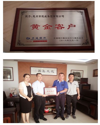 2016年10月25日上午,交通銀行惠州分行孔行長及曼哈頓支行黃行長蒞臨我司,授予我司“黃金客戶”榮譽(yù)稱號(hào)。林董事長親自接待了他們,并對他們的到來表示熱烈歡迎。